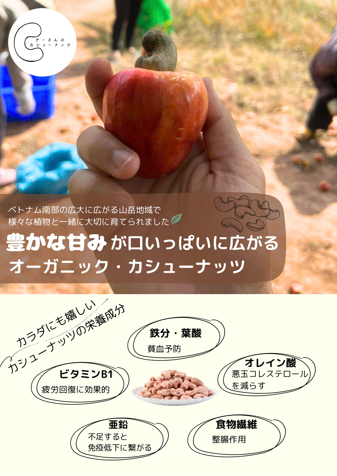 アジアリンクというユニークな輸入会社からオーガニックの皮付きカシューナッツが届きます。代表の新沼さんは毎年、産地まで足を運び、厳選した商品を輸入されています。